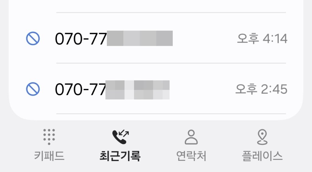 나중에 최근 기록을 보면 이렇게 나도 모르게 걸려왔다가 차단 된 070 전화번호를 확인할 수 있습니다. 왠지 내 일상을 방해하지 못하게 했다는 뿌듯함이 생겼습니다.
